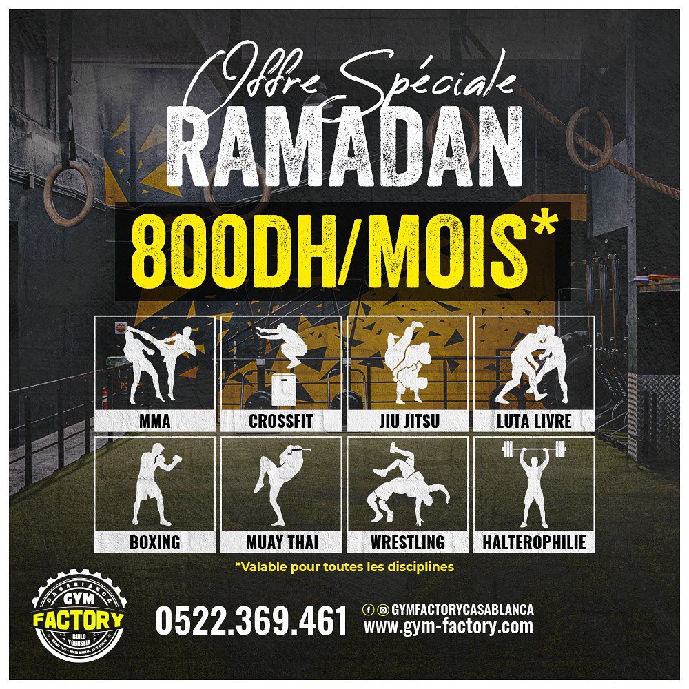 Offre spéciale ramadan 2021 chez Gym Factory !! Oui il y a un couvre feu,Mais ce n’est pas pour autant qu’on doit ce laissé aller ‼️ 800dhs le mois, accès a toutes les disciplines. Plus de renseignements au : 0522369461